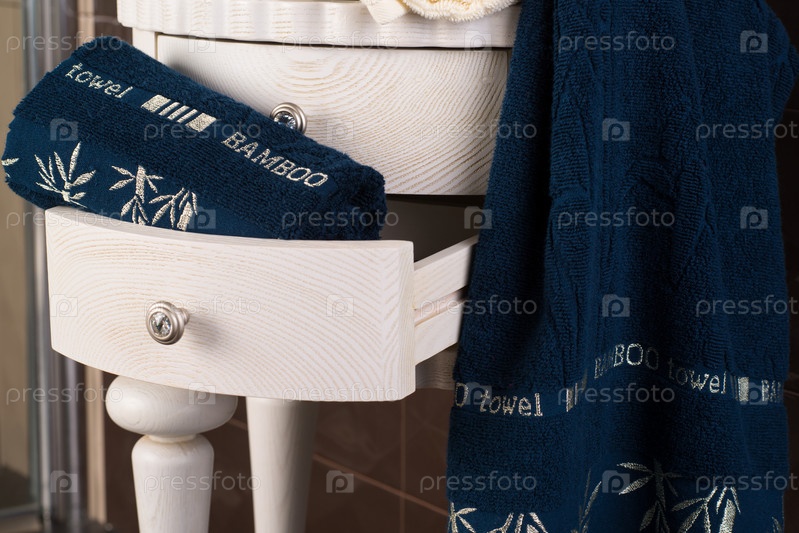 Снимок крупным планом душевой кабины с выдвижным ящиком с темно-синими бамбуковыми полотенцами