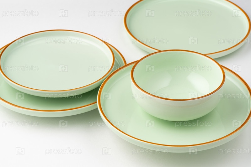 Набор пастельно-зеленой керамической посуды с оранжевыми очертаниями