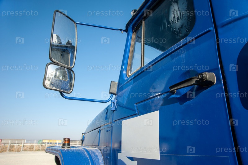 Крупный план двери синего самосвала с зеркалом заднего вида на строительной площадке