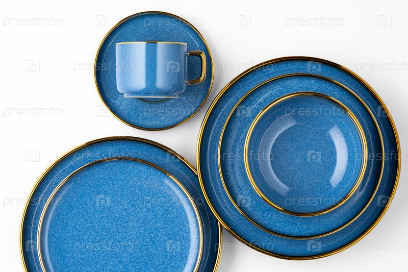 Набор синих керамических тарелок и чашки на белом фоне. Вид сверху
