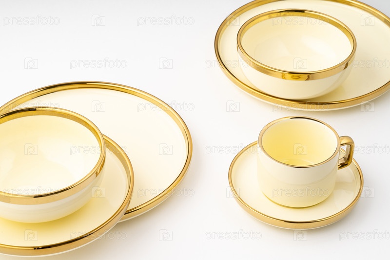Набор золотой роскошной керамической кухонной утвари на белом фоне