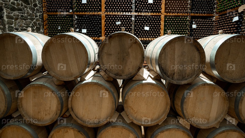 Деревянные винные бочки на фоне винного погреба