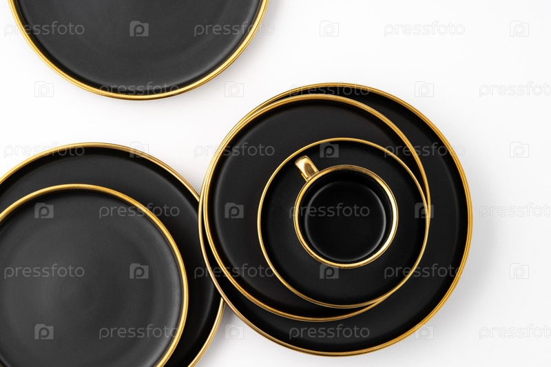 Набор черных и золотых керамических тарелок и чашки на белом фоне Вид сверху