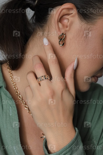 Крупный план стильной молодой женщины в украшениях с маленьким хвостиком и зеленой рубашкой
