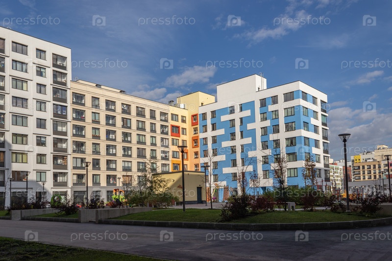 Современный многоквартирный дом с красочными фасадами на окраине города. Жилой комплекс «В лесу», Москва, Россия