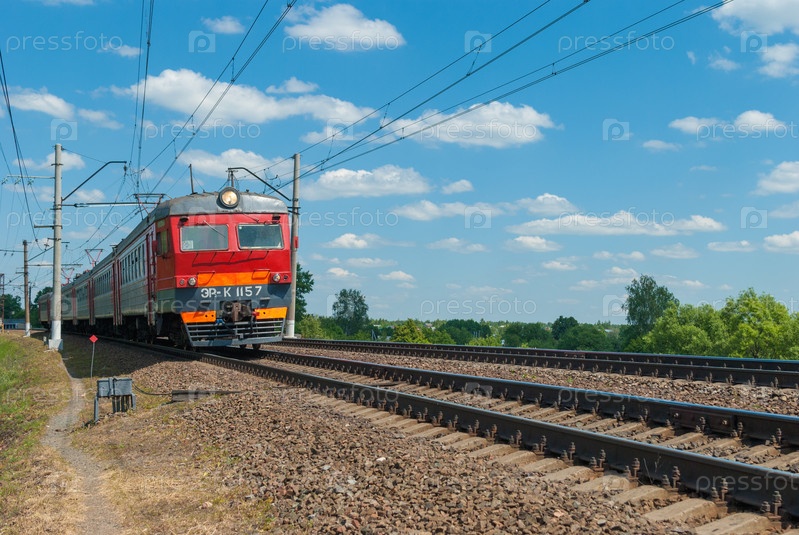 Пригородный поезд едет по железной дороге в России в солнечный день
