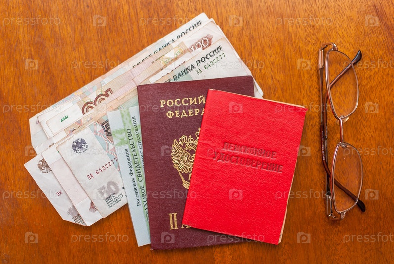 Деньги, баллы и пенсионное удостоверение на деревянной поверхности-перевод на русский язык: пенсионное удостоверение