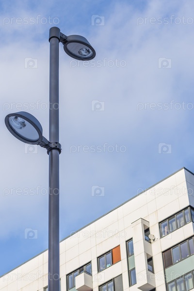Наружная наружная высокая двойная лампа на металлическом столбе. на фасаде жилого дома