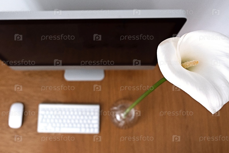 Рабочее место в минималистичном стиле. Монитор, клавиатура и мышь на деревянном столе рядом с домашним цветком и лилиями каллы. Скопируйте пространство