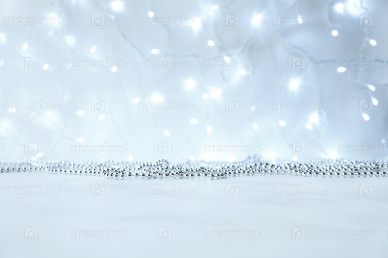 Новый год и Рождество фон с серебряными гирляндами с огнями с боке в размытии. Серые нейтральные цвета с копией пространства и макетом