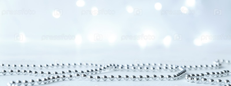 Баннер. Новый год и Рождество фон с серебряными гирляндами с огнями с боке в размытии. Серые нейтральные цвета с копией пространства и макетом