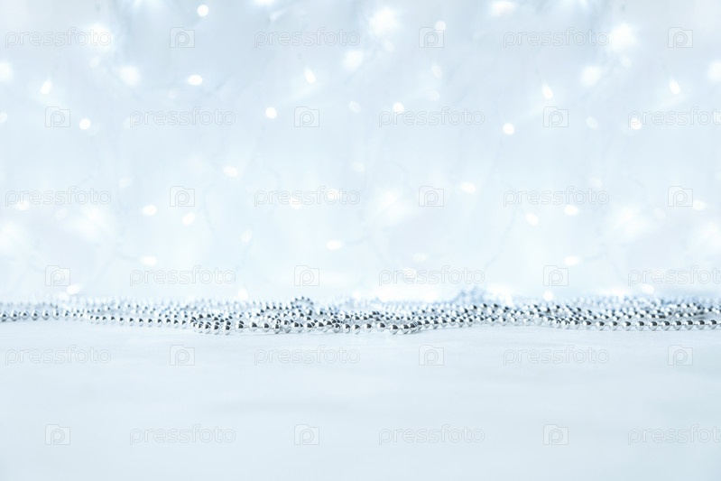 Новый год и Рождество фон с серебряными гирляндами с огнями с боке в размытии. Серые нейтральные цвета с копией пространства и макетом