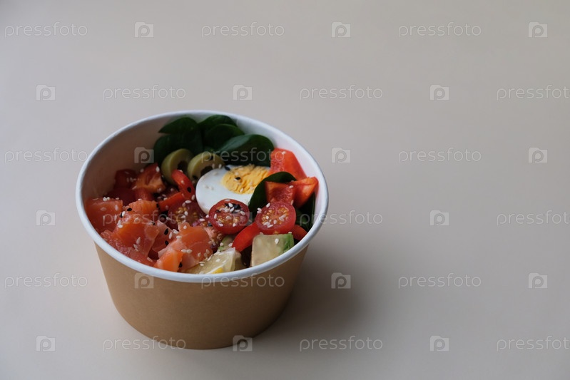 Поке на вынос со свежим лососем, авокадо, киноа и овощами в упаковке из переработанной крафт-бумаги. Здоровая модная еда для фитнеса