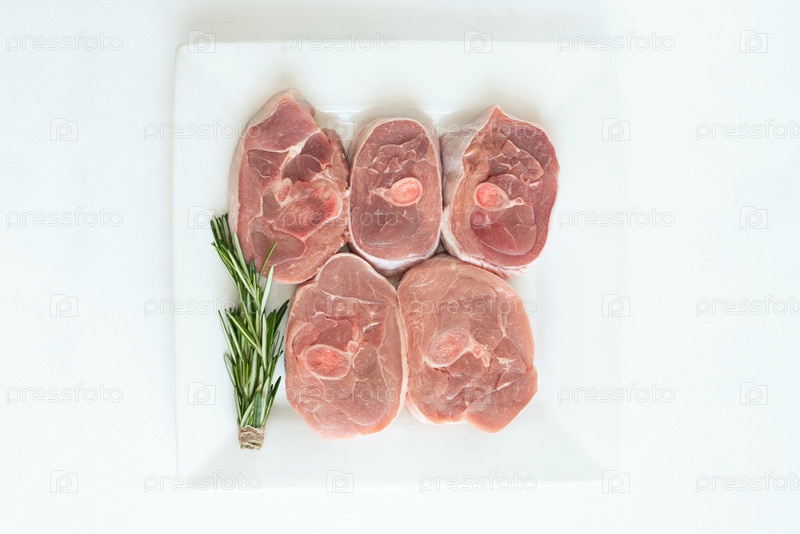 Кусочки сырого мяса индейки, нарезанный стейк из ноги, порционные кусочки барбекю, на круглой деревянной доске и на белом фоне с веточкой розмарина, помидорами и красным острым перцем. изолировать