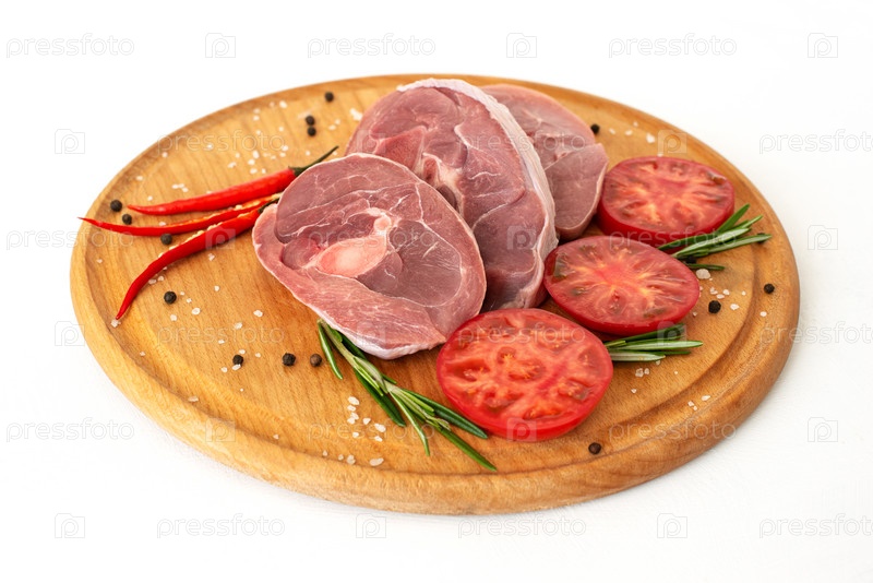 Кусочки сырого мяса индейки, нарезанный стейк из ноги, порционные кусочки барбекю, на круглой деревянной доске и на белом фоне с веточкой розмарина, помидорами и красным острым перцем. изолировать