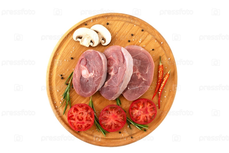 Кусочки сырого мяса индейки, нарезанный стейк из ноги, порционные кусочки барбекю, на круглой деревянной доске и на белом фоне с веточкой розмарина, помидорами и красным острым перцем. изолировать