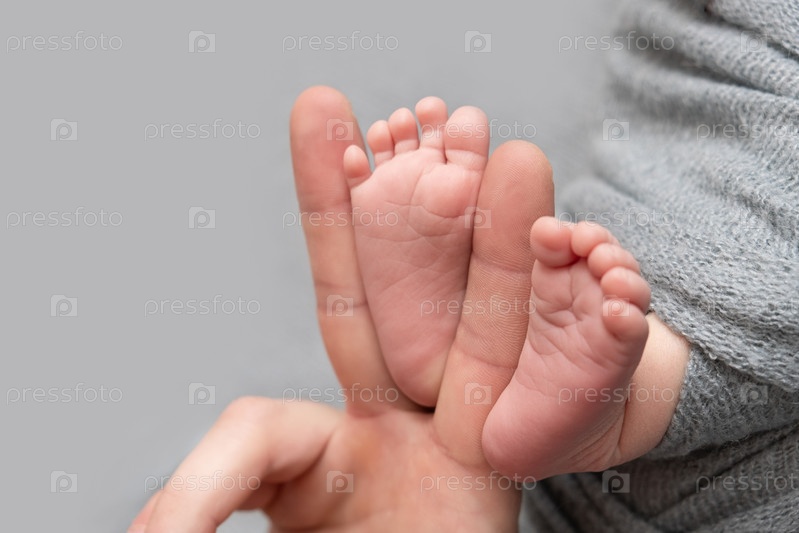 Отец держит ноги новорожденного. серый цвет. нежность. Концепция дня отца