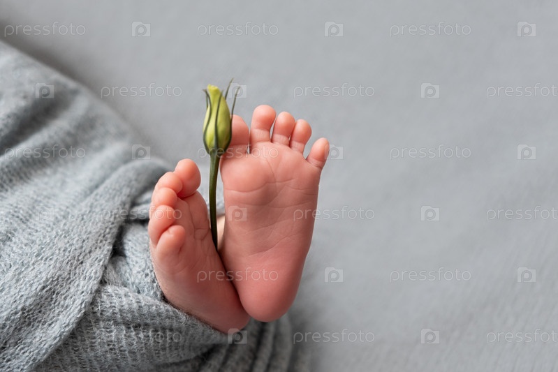Ножки новорожденного с цветком эустомы. серый цвет. нежность