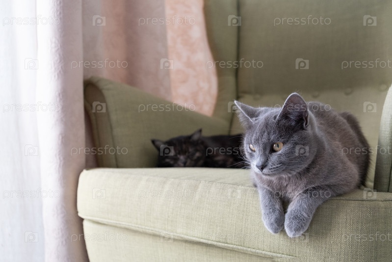 Крупным планом портрет домашней серой короткошерстной кошки, сидящей на зеленом кресле. два кота дома. Изображение для ветеринарной клиники, корма для животных, кошачьего блога