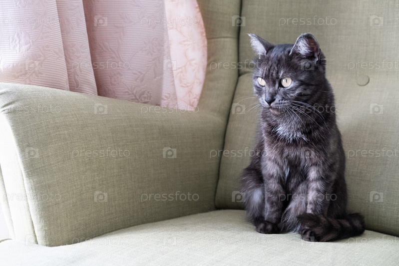 Крупным планом портрет домашней серой короткошерстной кошки, сидящей на зеленом кресле. два кота дома. Изображение для ветеринарной клиники, корма для животных, кошачьего блога