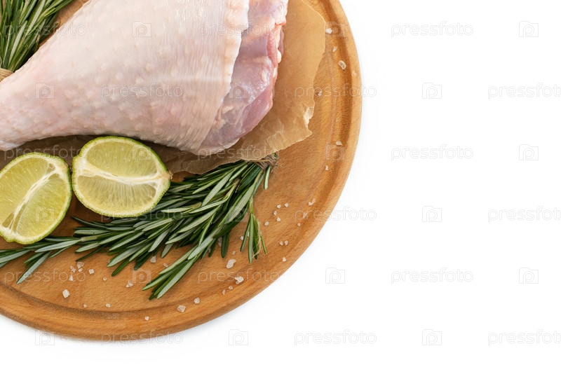 Aw ножка разделочной доски индейки с лаймами и петрушкой на белом фоне, изолировать