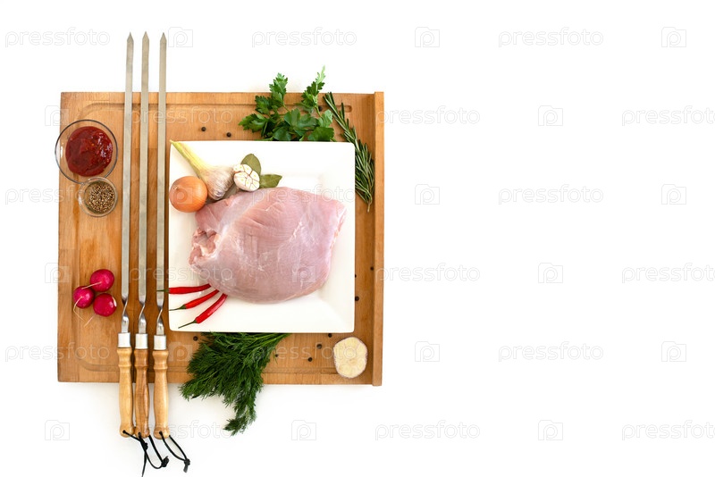 Сырое мясо индейки, филе для запекания на шампурах. Подготовка барбекю. ингредиенты
