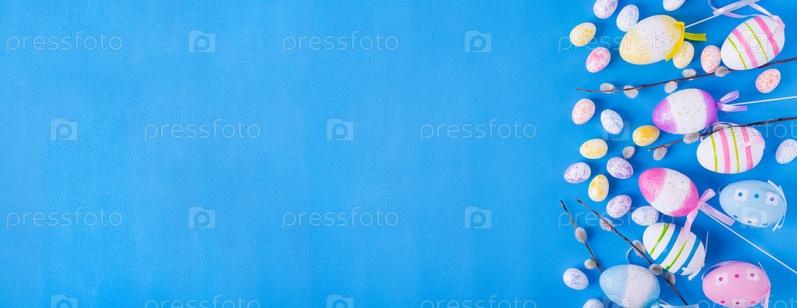 Пасхальный фон с разноцветными декоративными яйцами и ветками ивы на синем. Веб-баннер с копией пространства