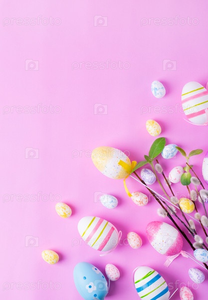 Пасхальный фон с разноцветными декоративными яйцами и ветками ивы на розовом. Праздничная плоская планировка. Копировать пространство