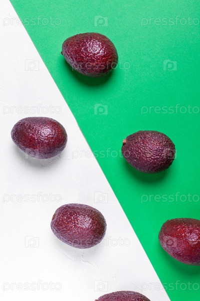 Фиолетовые авокадо на геометрическом зелено-белом фоне