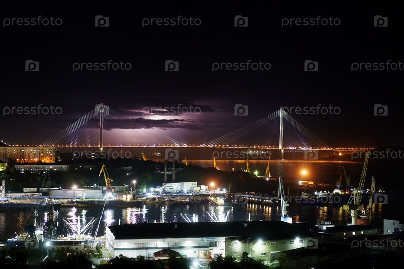 Владивосток, Россия - 25 июня 2022 г.: Ночной пейзаж, гроза. Городской пейзаж с видом на рыбацкий порт Диомеда