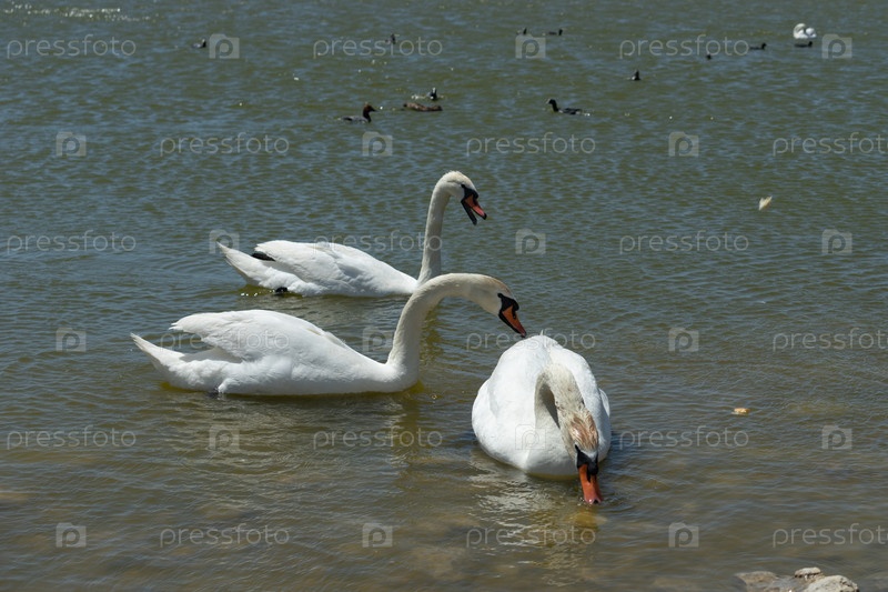 Белые лебеди на водной глади озера Сасык-Сиваш в Евпатории. Привлекательность и красота природы Крыма