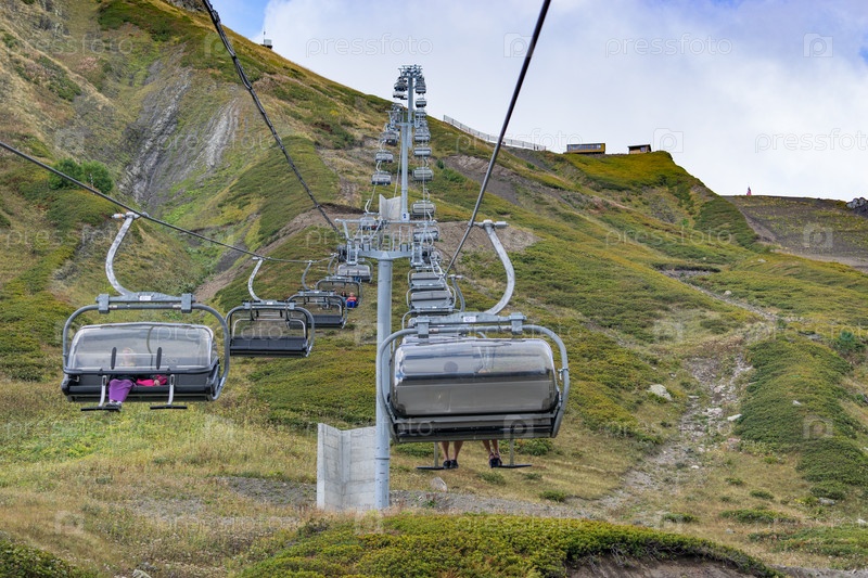 Горный пейзаж со скалистыми склонами и канатной дорогой в Красной Поляне