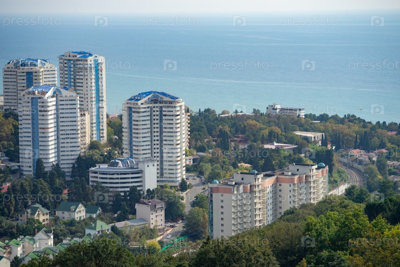 Городской пейзаж с высоты на фоне моря