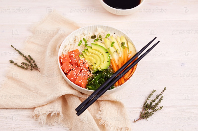 Поке боул с лососем, рисом, авокадо, манго, водорослями, морковью, кунжутом и соевым соусом