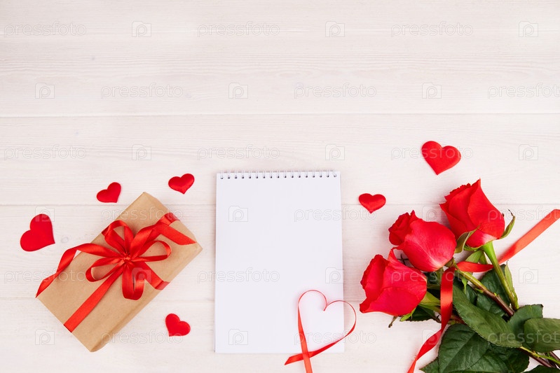 Букет красных роз, подарочная коробка с красной лентой, пустой блокнот