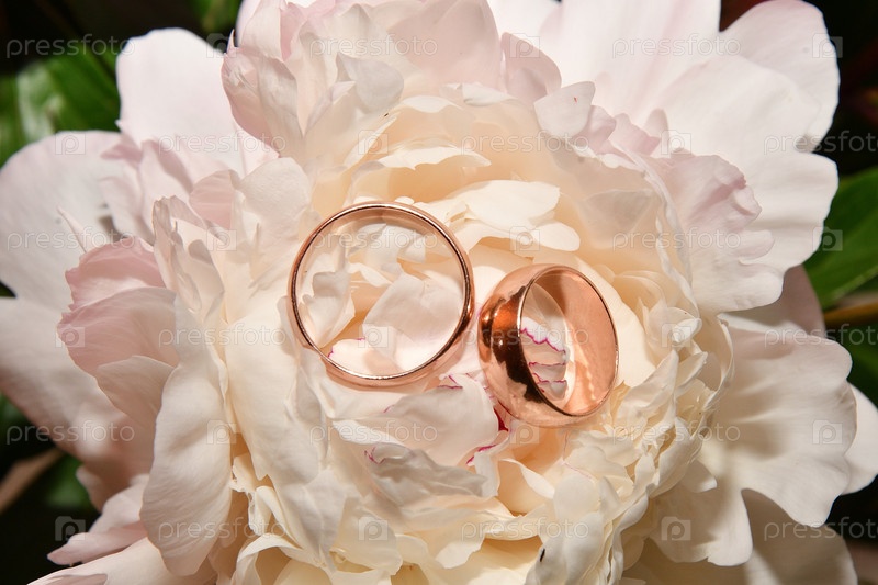 Два обручальных кольца и цветок пиона