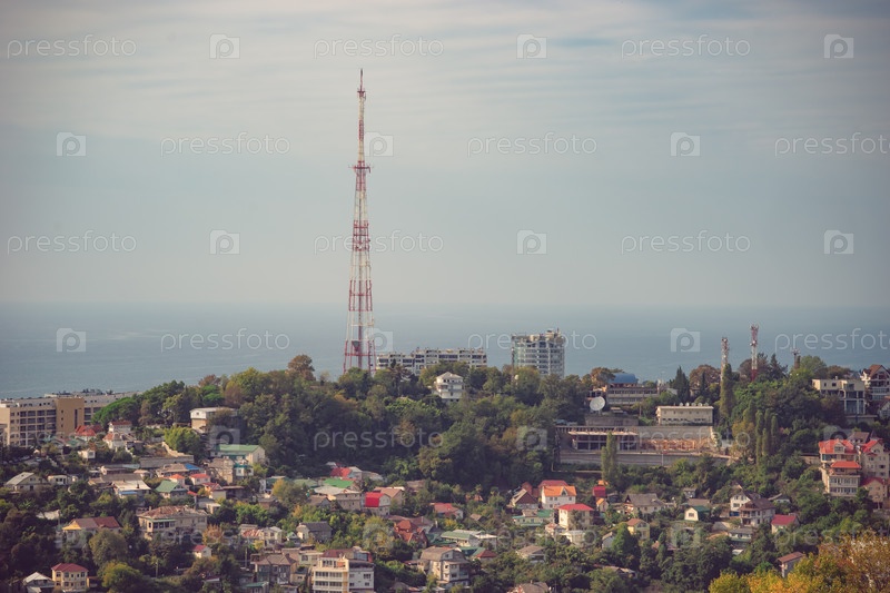 Городской пейзаж с высоты на фоне моря