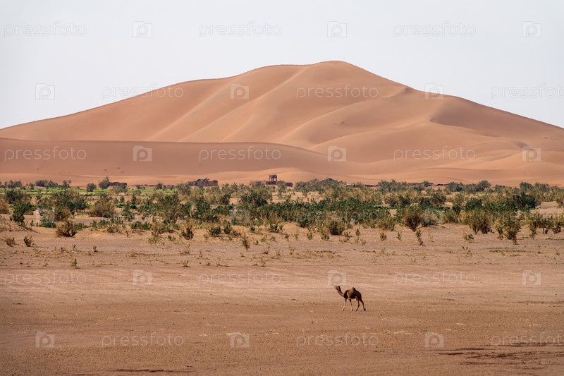 Верблюды гуляют возле больших дюн в пустыне