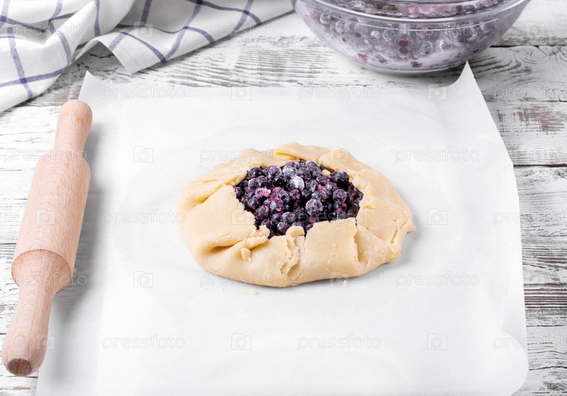 Формирование галет с песочным тестом и черникой на белом столе. Процесс приготовления десерта