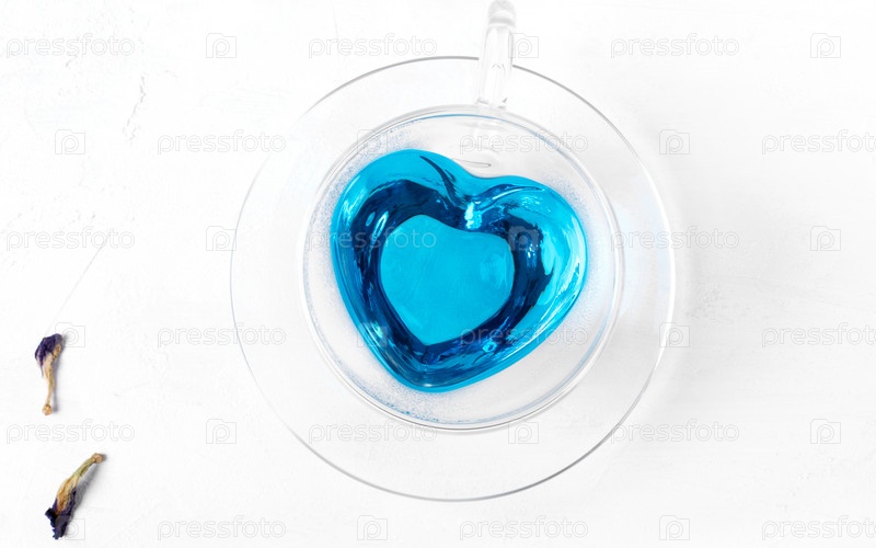 Чай Анчан в стеклянной чашке в форме сердца на белом столе. Вид сверху