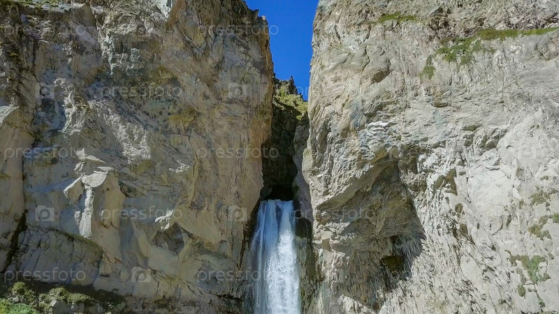 Приэльбрусье. Девушка на фоне водопада. Водопад Султан на реке Кызыл-Су. С высоты птичьего полета. Кабардино-Балкария, Россия