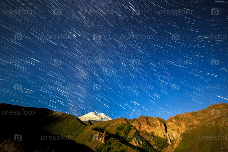 Звезды рисуют линии и облака. Ночной пейзаж. Россия. Эльбрус
