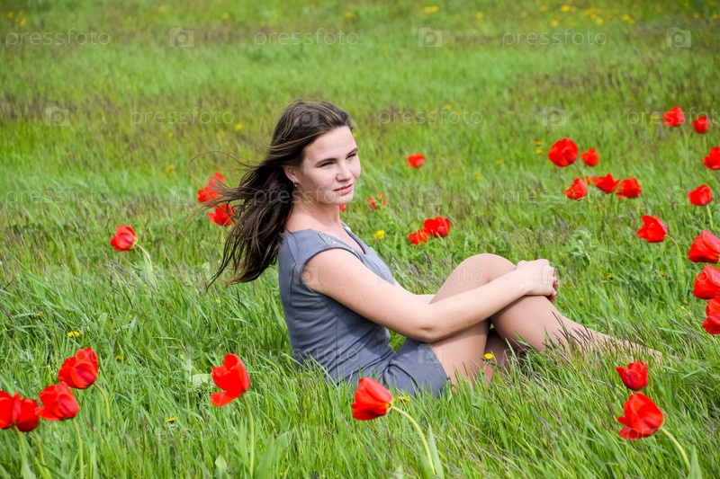 Красивая фея маленькая девочка в поле среди цветов тюльпана
