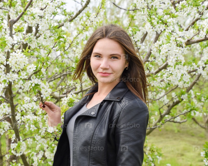 Красивая фея молодая девушка в цветущем сливовом саду. Портрет девушки на фоне белых цветов