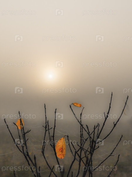 Осеннее поле. Серое туманное утро и желтые листья