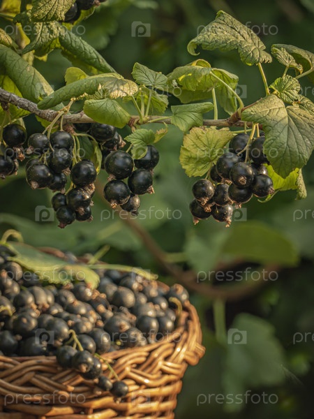 Собранная черная смородина в плетеной корзине под плодоносящей веткой смородинового куста