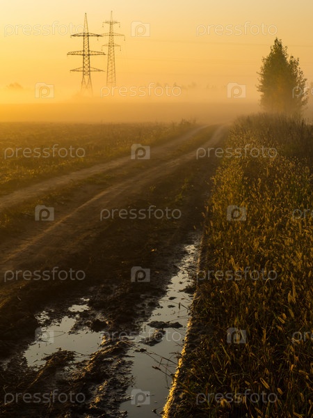 Туманное утро на вспаханном поле с линиями электропередач и проселочной дороге с трассой, заполненной дождевой водой