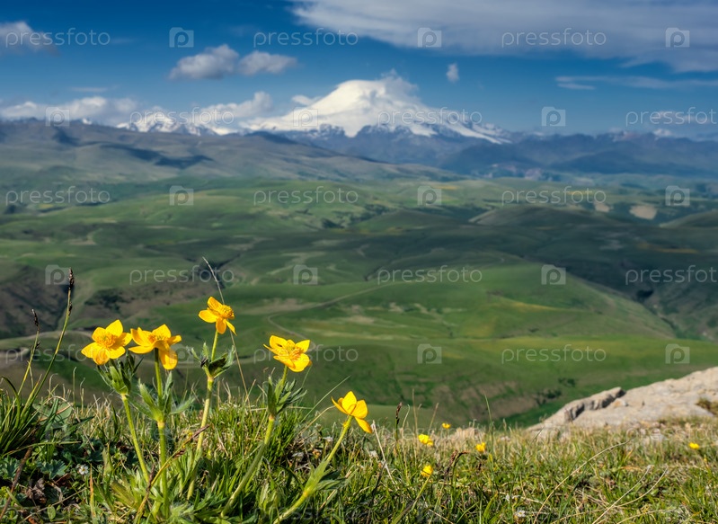 Гора Эльбрус и желтые цветы