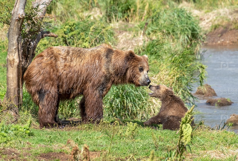 Самка бурого медведя и ее детеныш