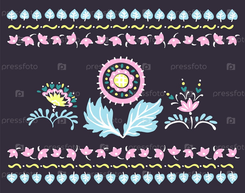 Набор этнических элементов. Бордюр представляет собой полосу с цветами, листьями, ветками, вензелями. Народная вышивка. Славянский, украинский, русский мотив. Хохлома, матрешка, дымковская игрушка. Мексиканский, индийский, цыганский ковер. Вязаное кружево